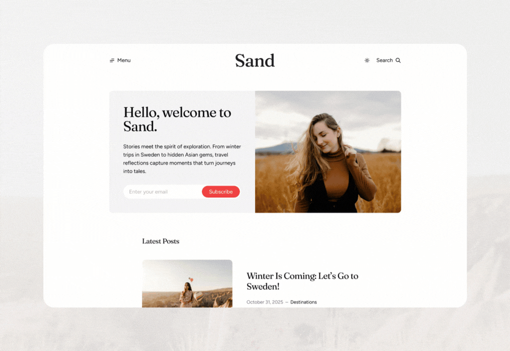 Sand offers flexible options to create a clean and engaging hero. Customize the hero title and subtitle, and optionally add an extra paragraph with a description. This helps set the tone of your site from the very first impression and also allows you to customize post titles.
