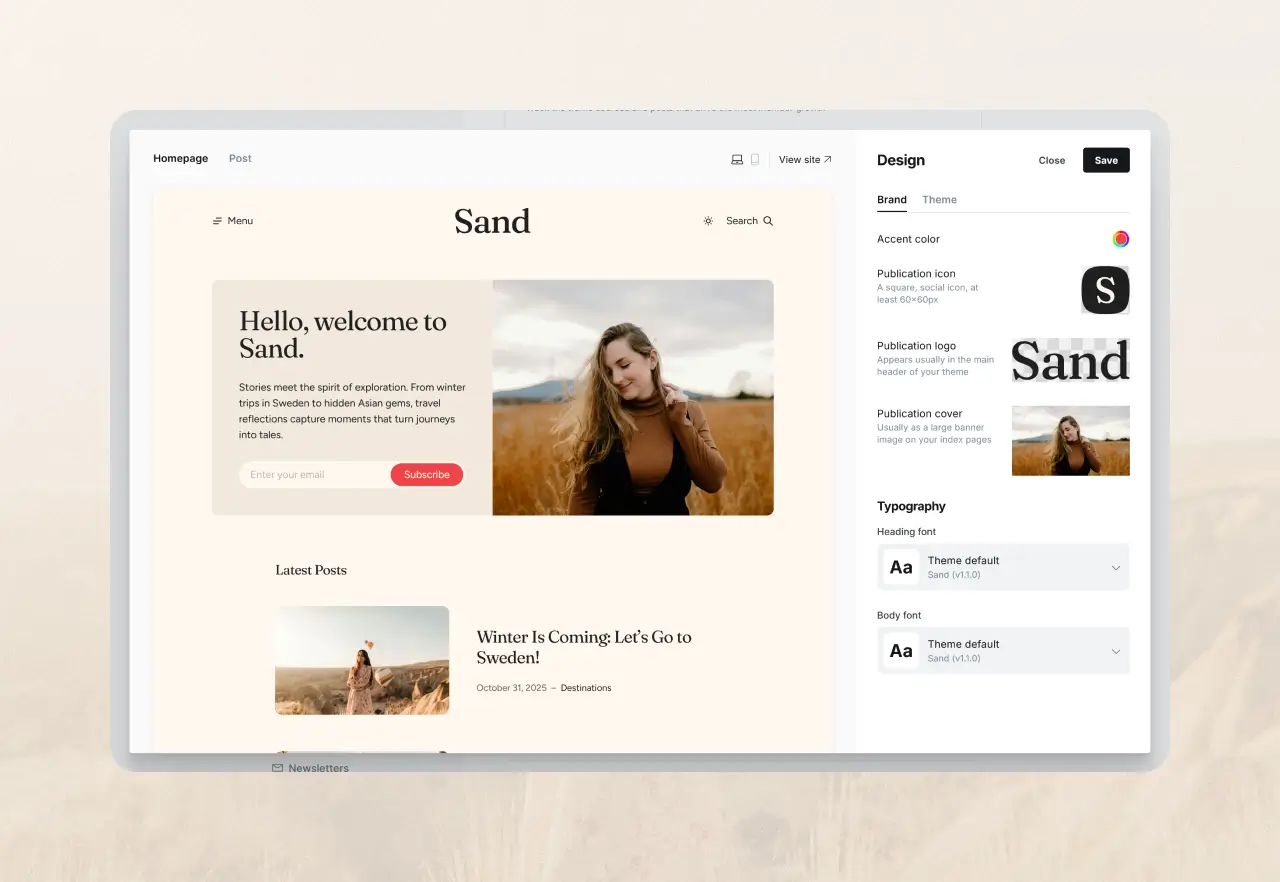 Personalize every detail of your site with ease. In the Brand section, choose an accent color to define the visual identity of your site. Choose between local or system fonts, upload a publication cover image used in the hero section, add your logo and favicon. With more than 20+ custom settings, Sand gives you flexibility while keeping the setup simple and consistent.
