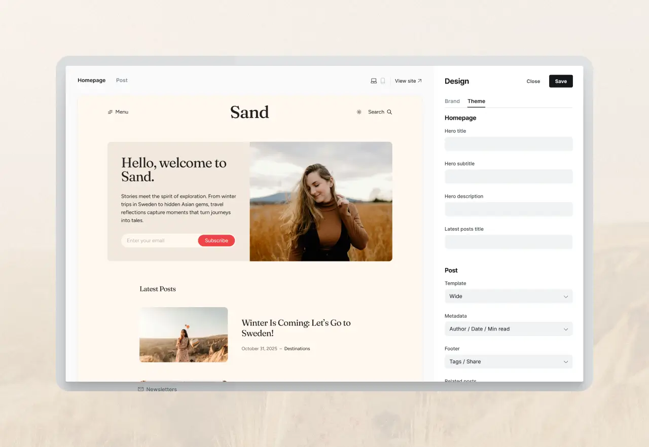 Sand is a Ghost theme made for people who love to share stories. Inspired by the simplicity of travel and clean design, it offers a relaxed reading experience. It works perfectly for personal blogs, travel journals, or any publication that values authenticity and storytelling.